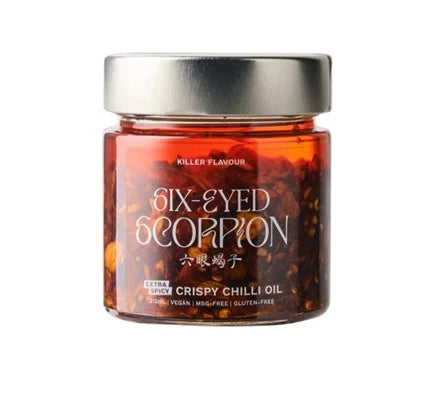 EXTRA SPICY CRISPY CHILLI OIL from Six-Eyed Scorpion- An unparalleled balance of spicy, salty, sweet, and savoury deliciousness, with crispy shallots, garlic, three types of chillies, and a plethora of fragrant aromatics.