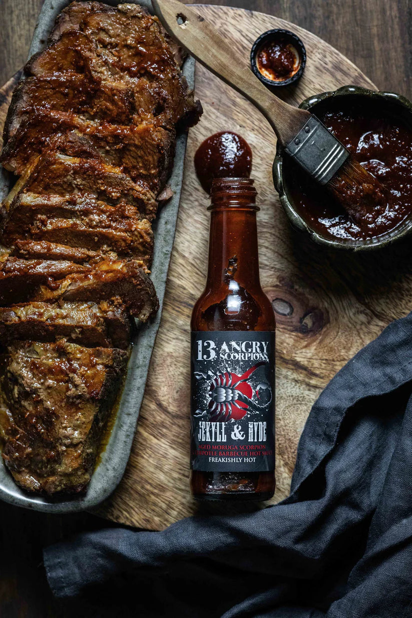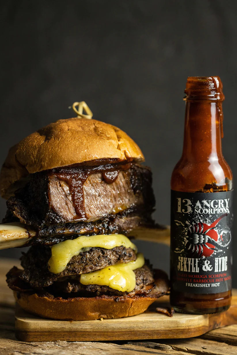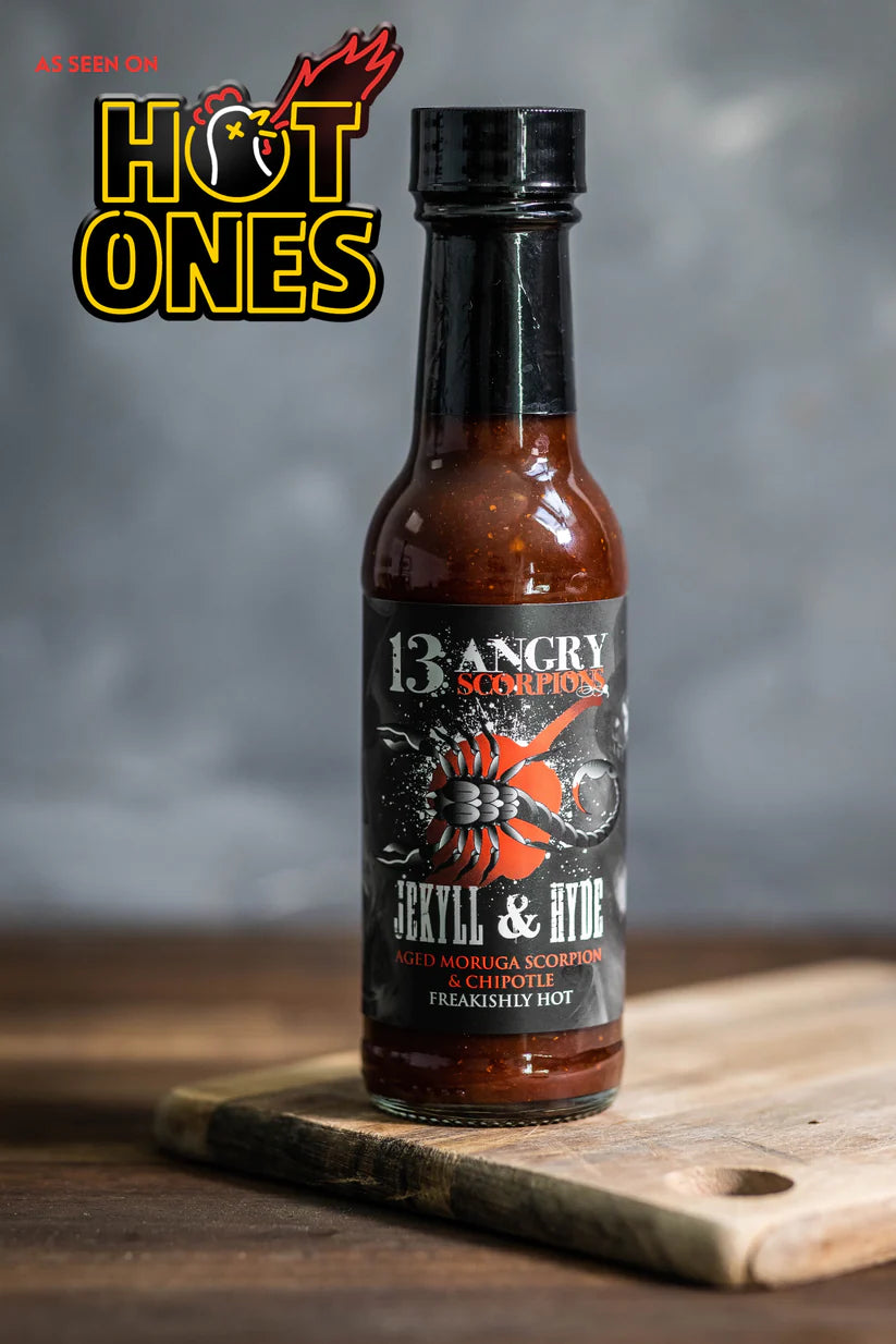 Wood-Smoked Red Jalapeño Peppers, apple cider vinegar, tomato and brown sugar, with 13 Angry Scorpions own signature spice rub, bringing to the table an extra hot sauce with a rich and rustic flavour profile. Jekyll & Hyde isn’t just an award winning sauce, it’s an absolute game changer with all your favourite meals - so it’s just as tasty with Mexican or Asian cuisine, as it is on a brisket burger with onion rings!