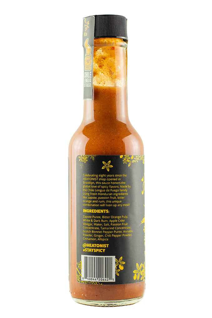 Ingredients: Zapote Puree, Bitter Orange Pulp, White & Dark Rum, Apple Cider Vinegar, Water, Salt, Passion Fruit Concentrate, Tamarind Concentrate, Scotch Bonnet Pepper Puree, Annatto Powder, Ginger, Chili Pepper Powder, Cinnamon, Allspice
