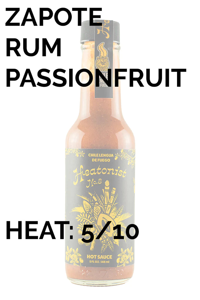 Every April 20th The Heatonist celebrate the anniversary of opening their flagship Brooklyn hot sauce shop and tasting room by creating a hot sauce that highlights a special ingredient never used in a hot sauce before. For their latest anniversary sauce, HEATONIST No. 8, they worked with Honduran hot sauce phenom Carlos Castillo of Chile Lengua De Fuego to cook up a sauce using native Honduran zapote fruit. The zapote has a mild, sweet potato-like flavour that forms the base of this unique hot sauce. Tart passion fruit and bitter orange awaken the taste buds to the sweetness of Honduran rum, which mingles with ginger and the fruity heat of Scotch Bonnet peppers. Annatto, another Central American ingredient sometimes called achiote, gives this sauce its sunset orange colour. As we head into grilling season, you’re going to want to keep this sauce close at hand for caramelizing BBQ chicken, spicing up tacos, glazing pork chops, topping grilled halloumi and more. Spread some on a sandwich for a touch of sweetness, or add No. 8 to an icy cocktail for some hot-and-cold fun. Cheers to eight years of flavour!