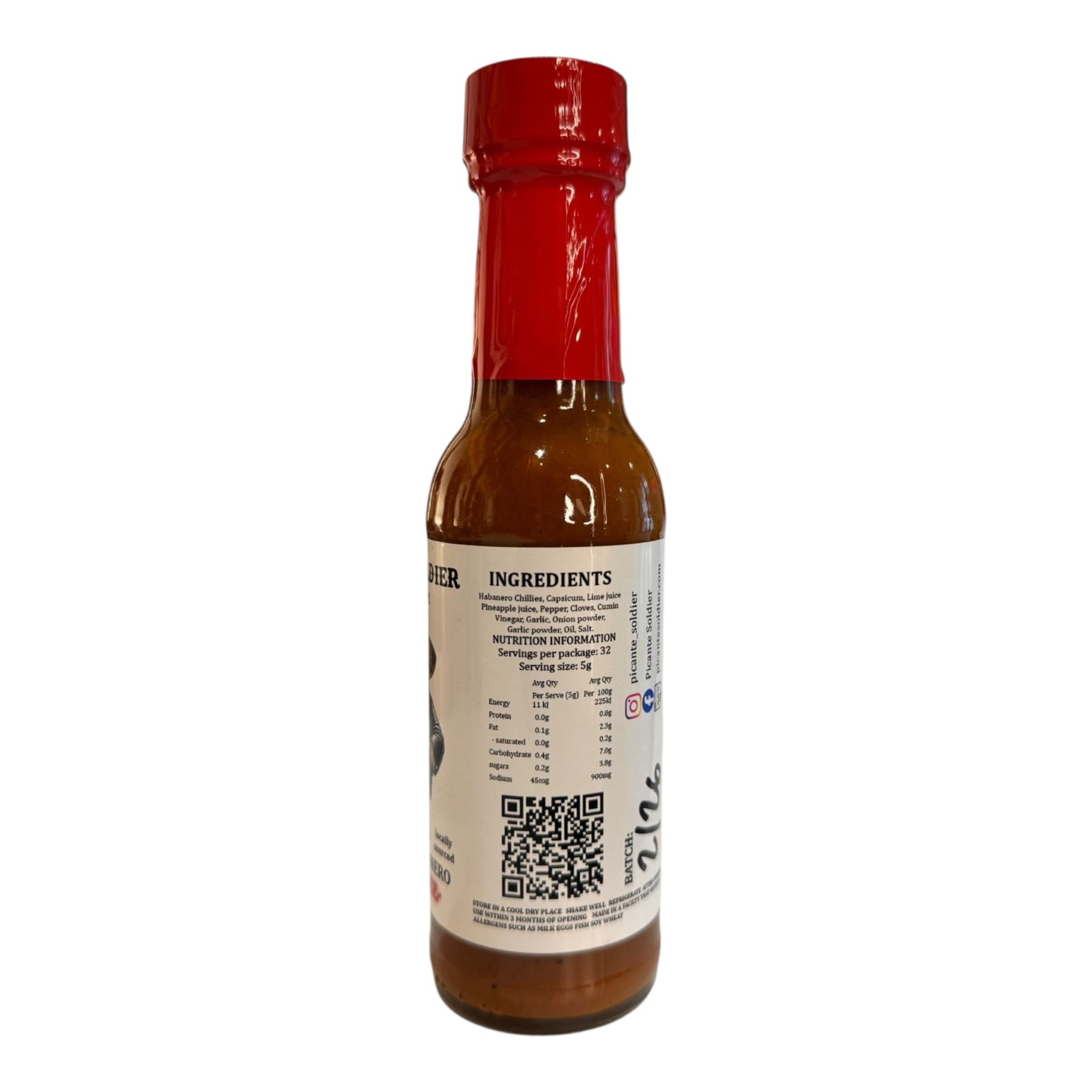 Ingredients: Habanero Chillies, Capsicum, Lime juice, Pineapple juice, Pepper, Cloves, Cumin, Vinegar, Garlic, Onion powder, Garlic powder, Oil, Salt