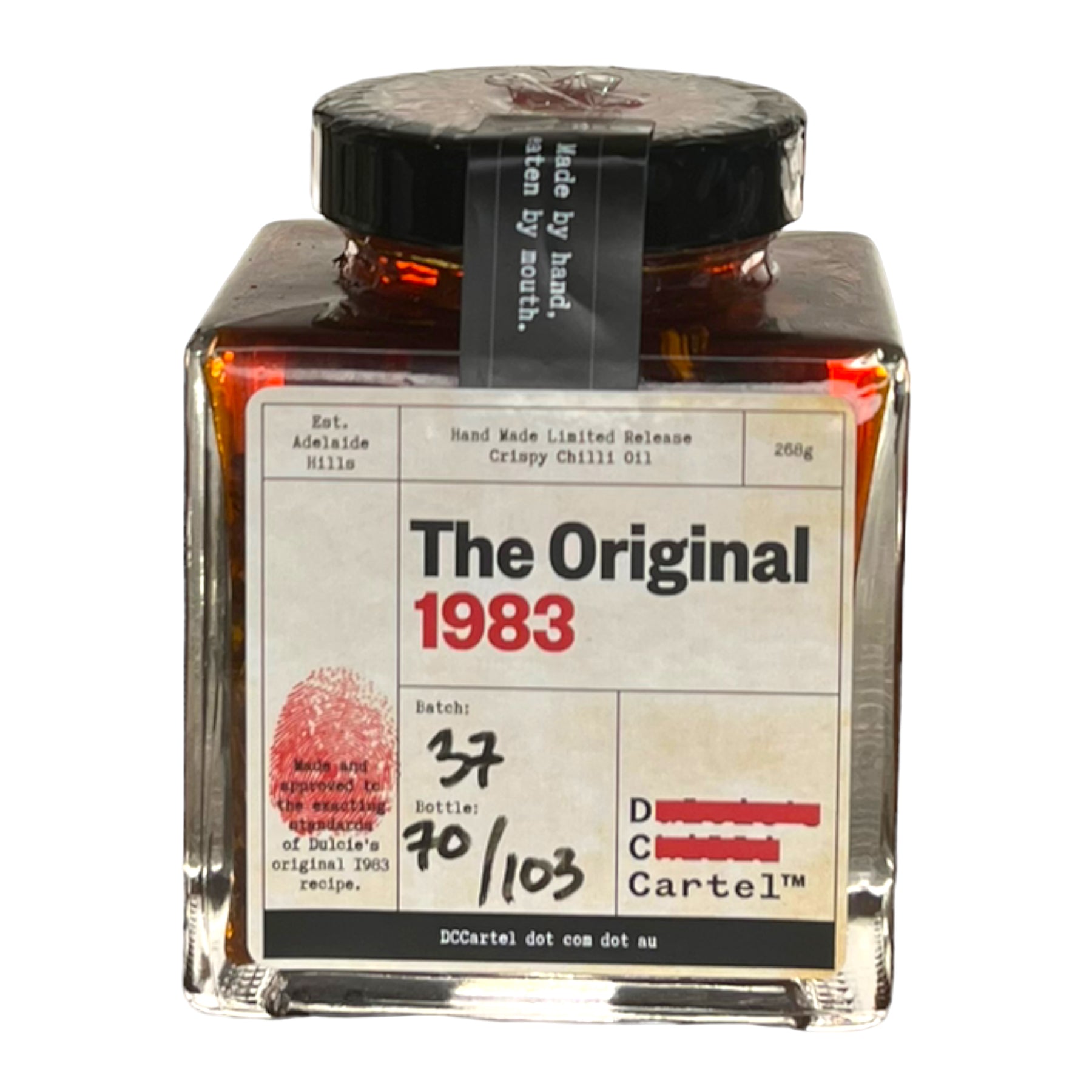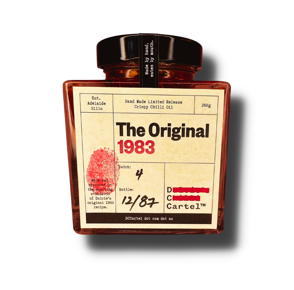 Australia’s only slow cooked limited release crispy chilli oil made from Nanna’s 40 year old recipe. Bursting with the taste of deep fried shallots and garlic this medium spice chilli oil goes on pretty much everything. From stir fry’s to eggs and avocado on toast, pizzas to pasta’s if you can think of it Dulcie’s Original 1983 makes it even better. Once you have had had the Original 1983 everything else just tastes like 2023.
